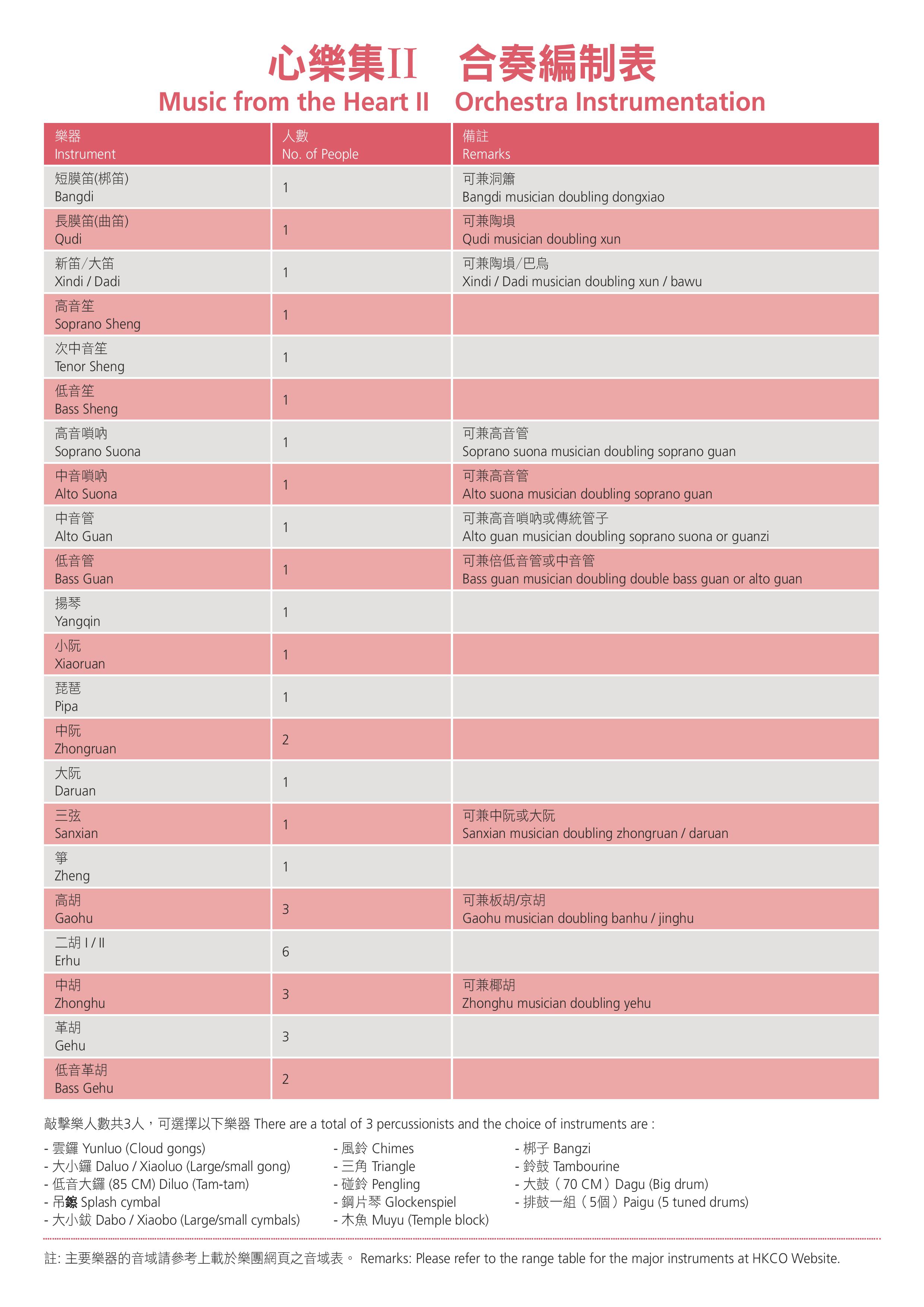 (For the 38-piece setup, please refer to the attached orchestra Instrumentation; and for the tonal range of instruments for the Chinese orchestra, please refer to Standard Orchestra Instrument Range Chart and Page Format of the Full Score Configuration of the Orchestra)