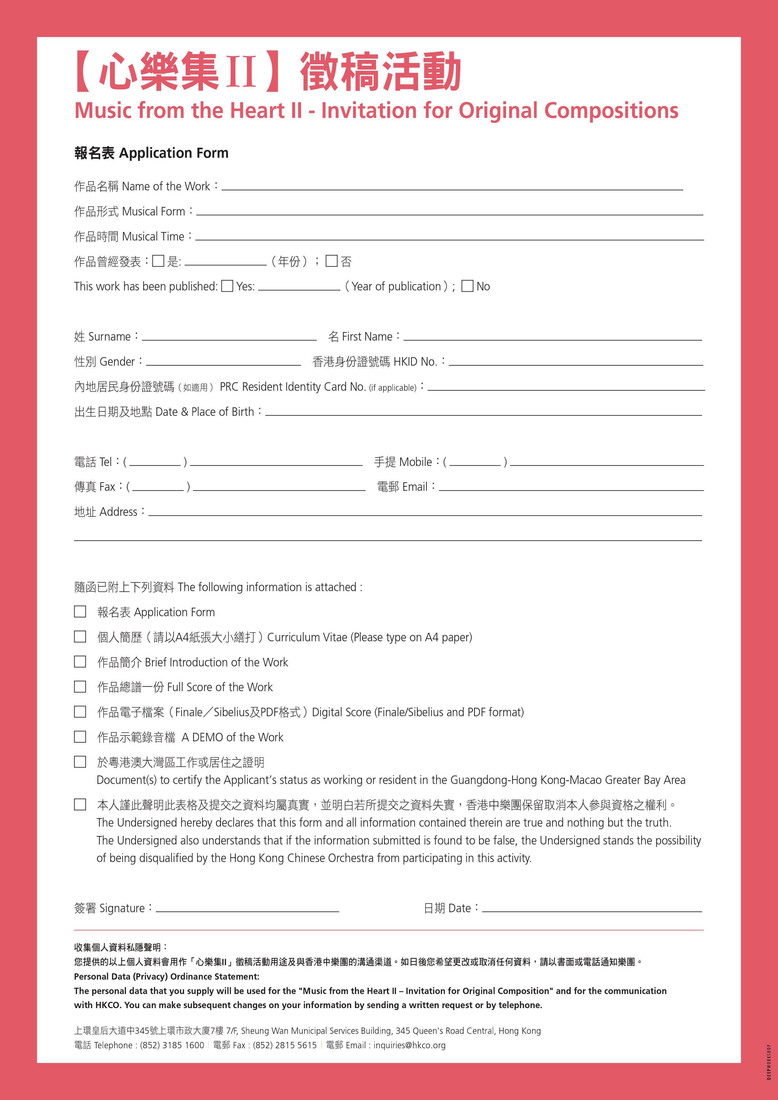 The personal data that you supply will be used for the communication, contacts and the promotion of latest information, programmes, events, discount and offers through the above stated channels. You can make subsequent changes on your choice of receiving further information (including direct marketing materials) by sending a written unsubscribe request to the following address or contact the Hong Kong Chinese Orchestra as stated below: