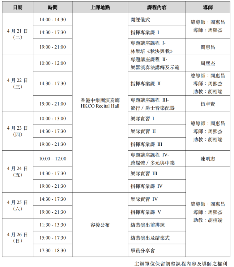 正式學員已於 2026 年 2 月 7 日 截止報名,而旁聽學員和觀摩學員則於 2026 年 3 月 10 日 截止報名。請填妥報名表,並附上個人正面指揮影音片段 1-2 份(僅限正式學員),電郵至hkco.program@hkco.org。錄取為正式學員的人士會於 2026 年 3 月初 獲得主辦方通知。獲錄取者,樂團將提供上課使用之總譜(請學員簽署版權聲明,本次提供之作品僅作為指揮大師班上課之用,日後如需公開售票演奏,請自行與作曲家處理版權事宜)。