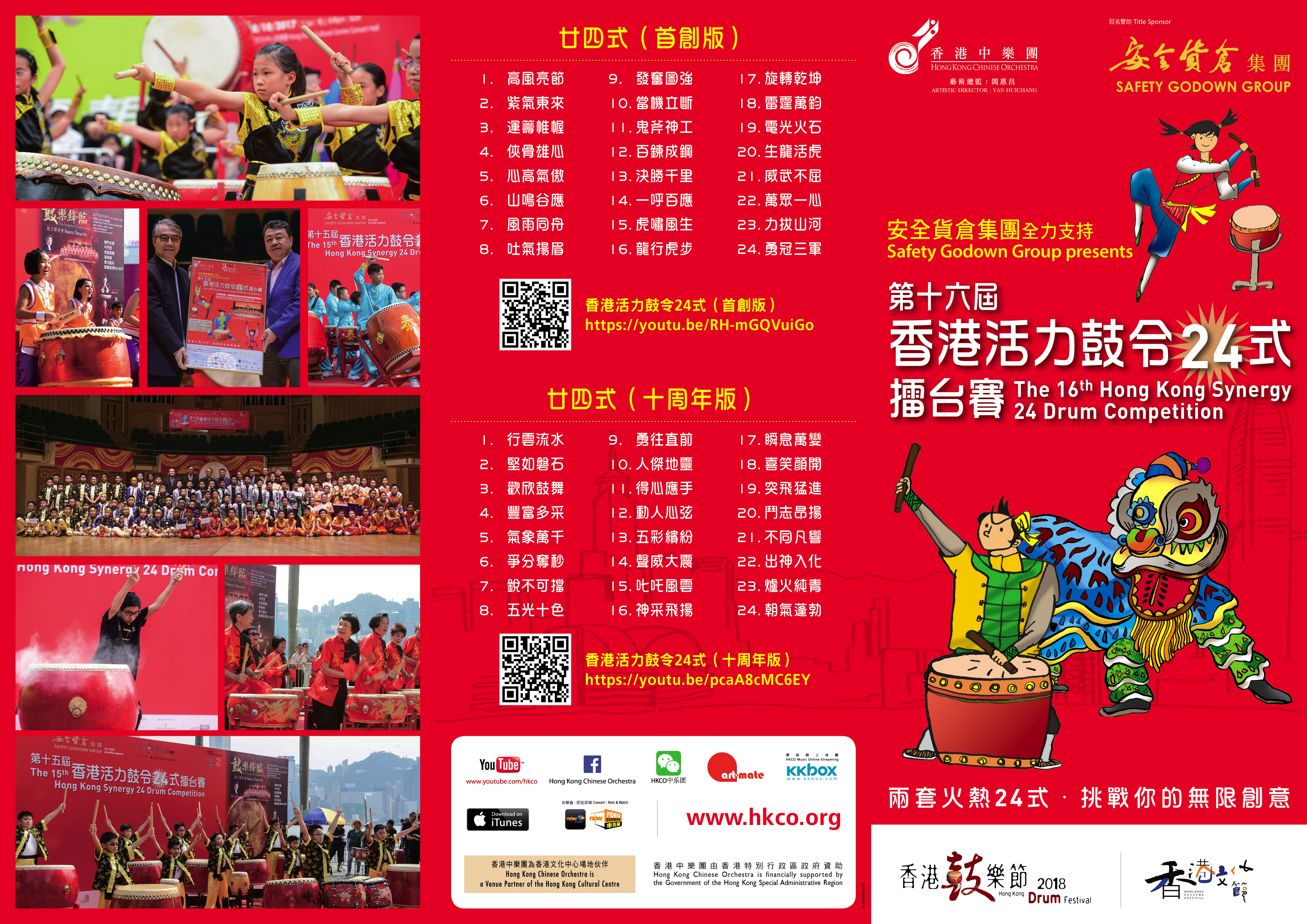 參賽人數最少2人,最多50人,可於兩套「香港活力鼓令24式」之第1式至24式內自選配搭表演招式及動作,或可根據「香港活力鼓令24式」為基礎作改編,時間以不超過6分鐘為 限。(但必須列明所引用的招式名稱)
